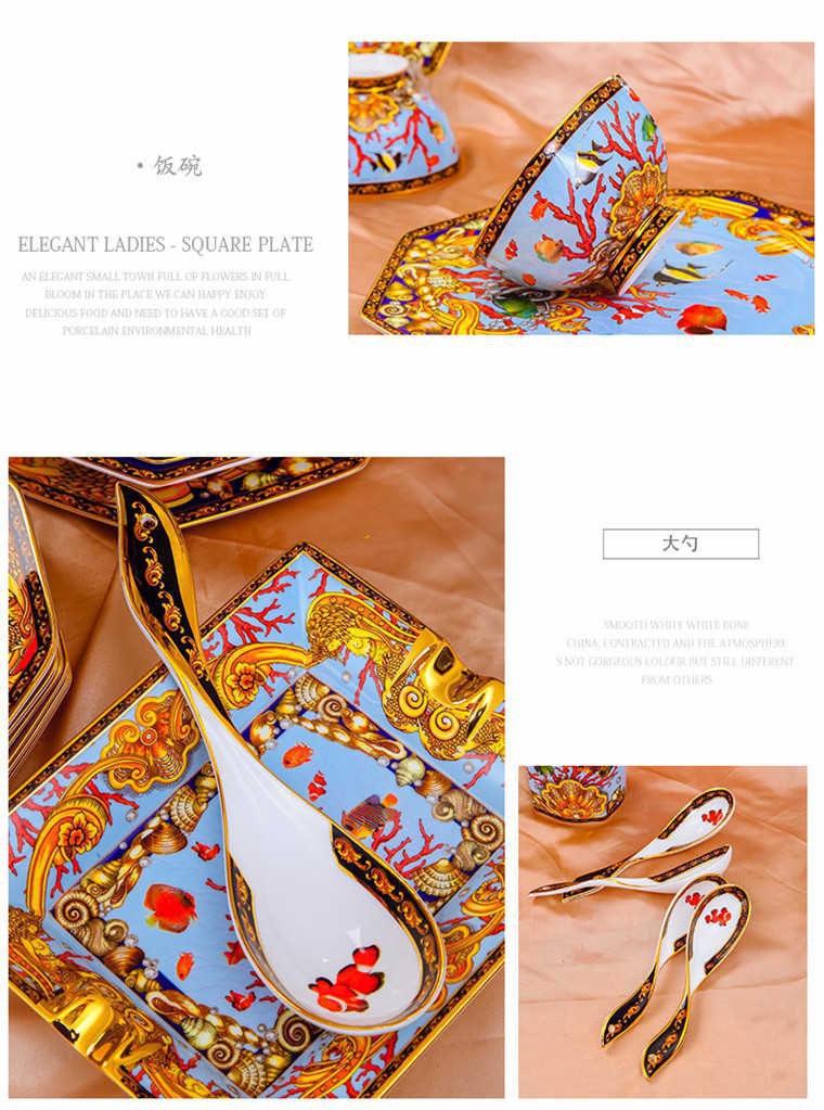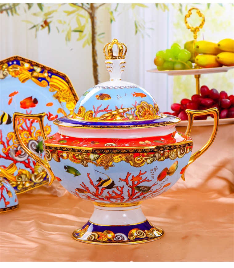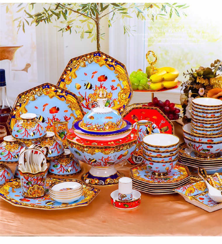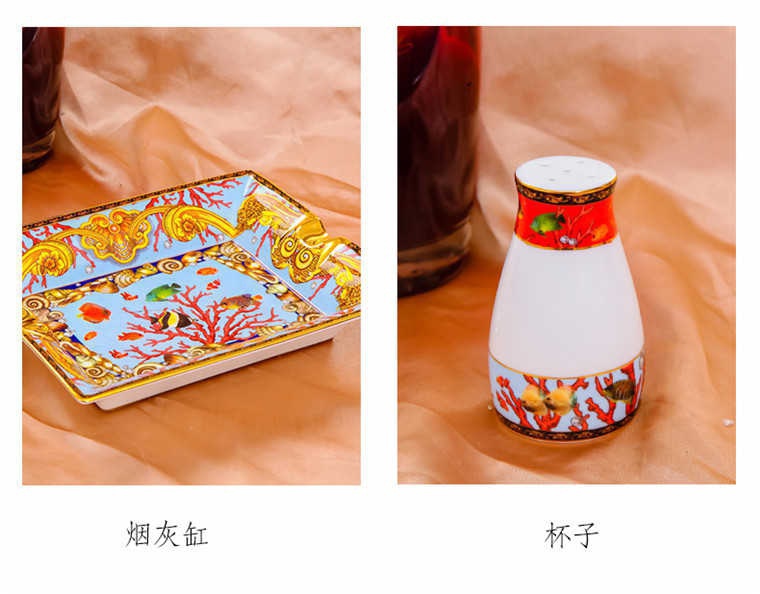 85頭釉中彩海底世界,一個湯煲,一個飯勺,一個魚盤,一個10.5寸平盤,一個10.5寸月光盤,雙層果盤一個,一個大煙缸,一個小煙缸,二個調(diào)料罐,一個牙簽筒,四個面碗,十個4.5寸飯碗,十個三寸調(diào)味碟,十個4寸湯碗,十個調(diào)羹,十個7寸骨碟,十個八寸盤,十個筷子架。