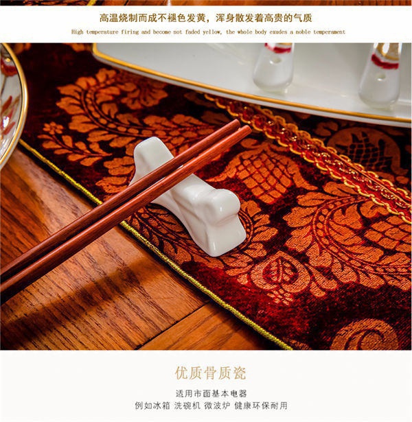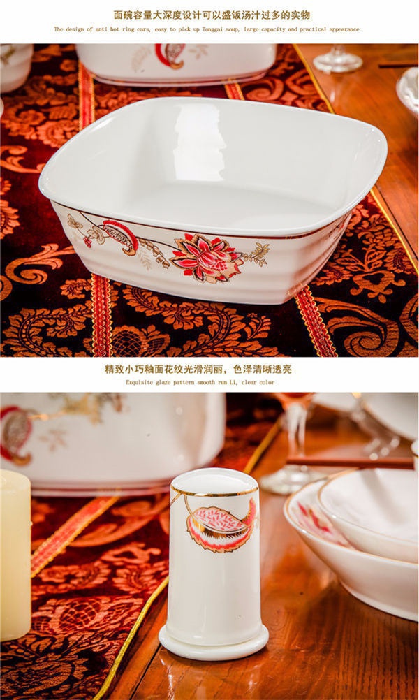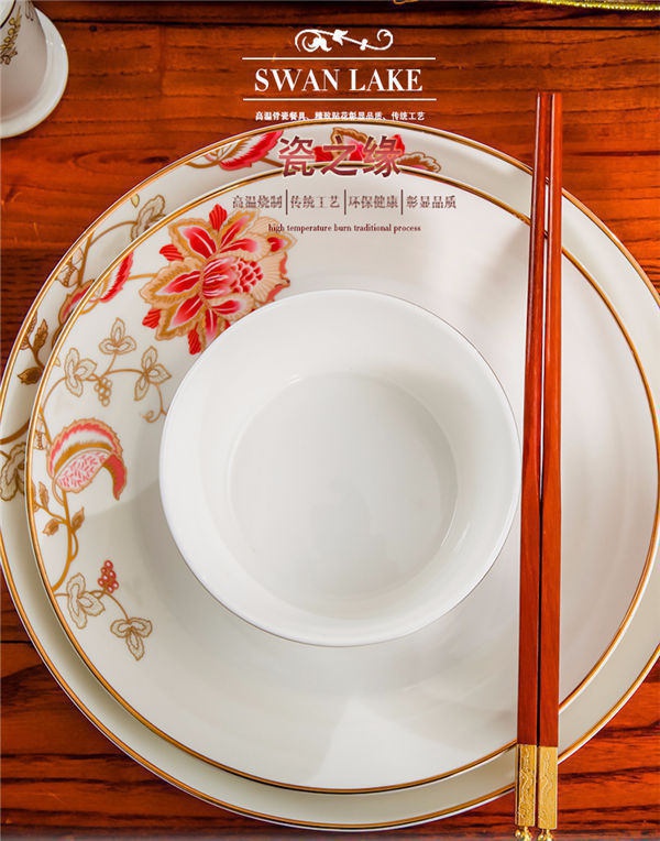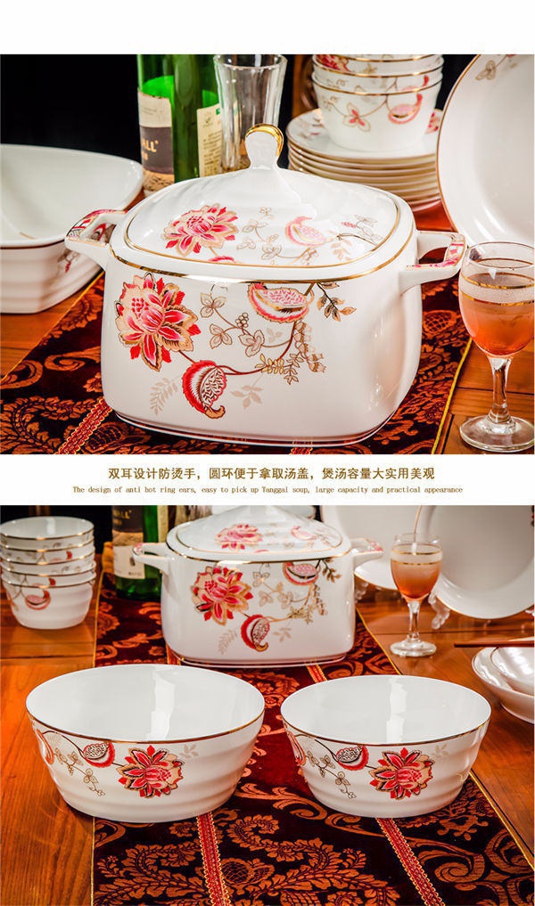 65頭醉花吟,一個湯煲,一個魚盤,一個大飯勺,一個大湯碗,一個牙簽筒,六個面碗,四個三寸碟,十個盤子,十個4.5寸飯碗,十個五寸骨碟,十個調羹,十個筷子架。