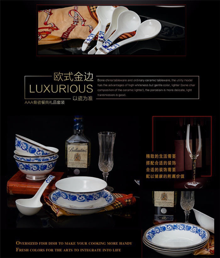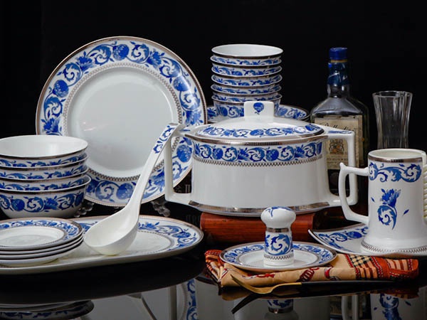 60頭德蘭城堡,一個湯煲,一個魚盤,一個十四寸圓盤,一個湯勺,一個牙簽筒,一個筷子筒,四個面碗,兩個沙拉碟,十個4.5寸飯碗,十個味碟,十個調(diào)羹,四個八寸圓盤,四個八寸方盤,十個筷子架。