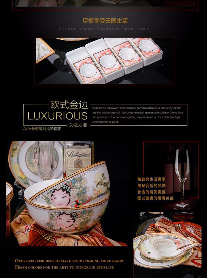 60頭臉譜,一個(gè)湯煲,一個(gè)飯勺,一個(gè)魚盤,一個(gè)十寸平盤,一個(gè)牙簽筒,一個(gè)煙灰缸,兩個(gè)面碗,兩個(gè)大湯碗,一個(gè)花籃,一個(gè)鳥,八塊八寸盤,十個(gè)4.5寸飯碗,十個(gè)骨碟,十個(gè)調(diào)羹,十個(gè)筷子架。