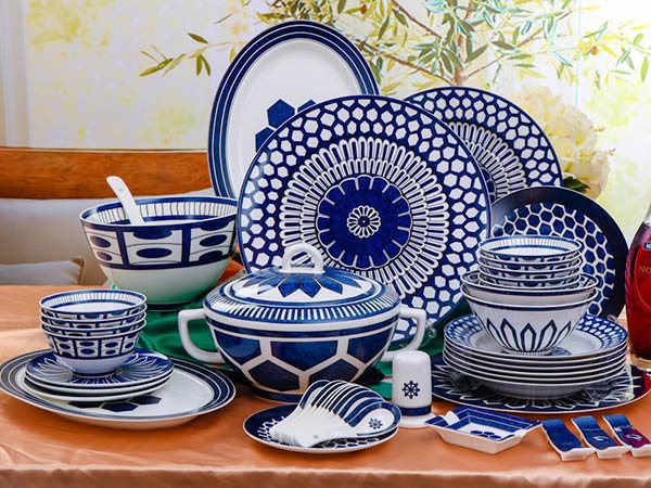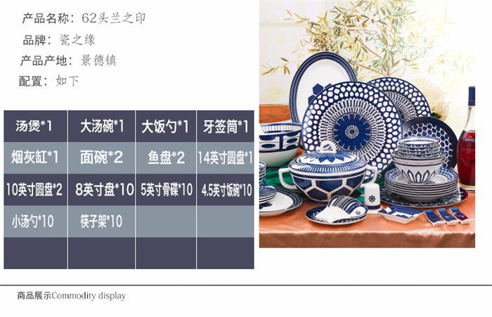 62頭蘭之印,一個湯煲,一個大湯碗,一個大飯勺,一個牙簽筒,一個煙灰缸,兩個面碗,兩個魚盤,一個14寸圓盤,兩個10寸圓盤,十個8寸盤,十個4.5寸飯碗,十個5寸骨碟,十個小湯勺,十個筷子架。