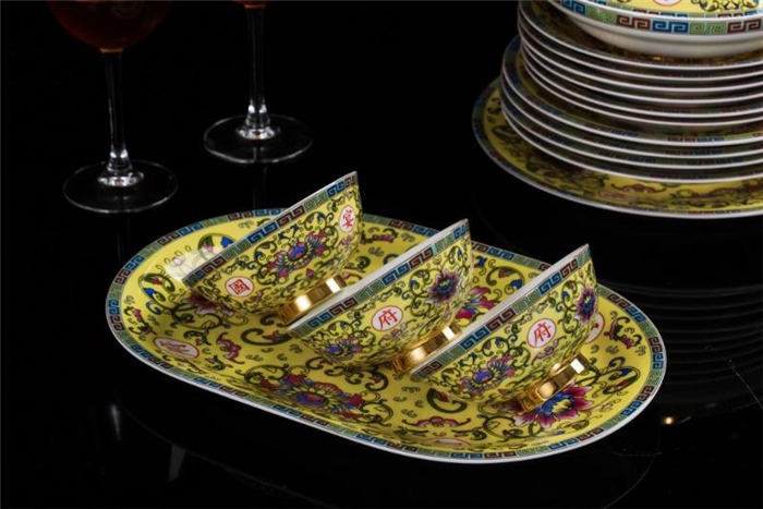 十個碗,7寸骨盤十塊,盤子十塊,小勺十個,筷子架十個,面碗四個,魚盤一個,大圓盤一塊,湯煲一個,合和器2套四塊,燉盅2套四個,果盤1套二個,大飯勺一個。