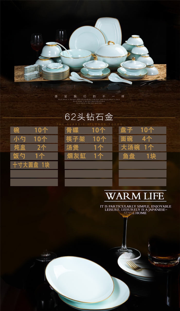 碗十個,骨盤十個,盤子十個,小勺十個,筷子架十個,面碗四個,燉盅二個,湯煲一個,大湯碗一個,飯勺一個,煙灰缸一個,魚盤一塊,十寸大 圓盤一塊。