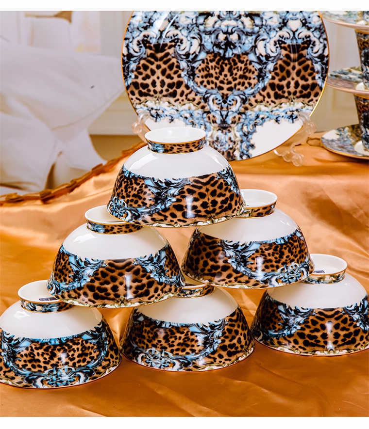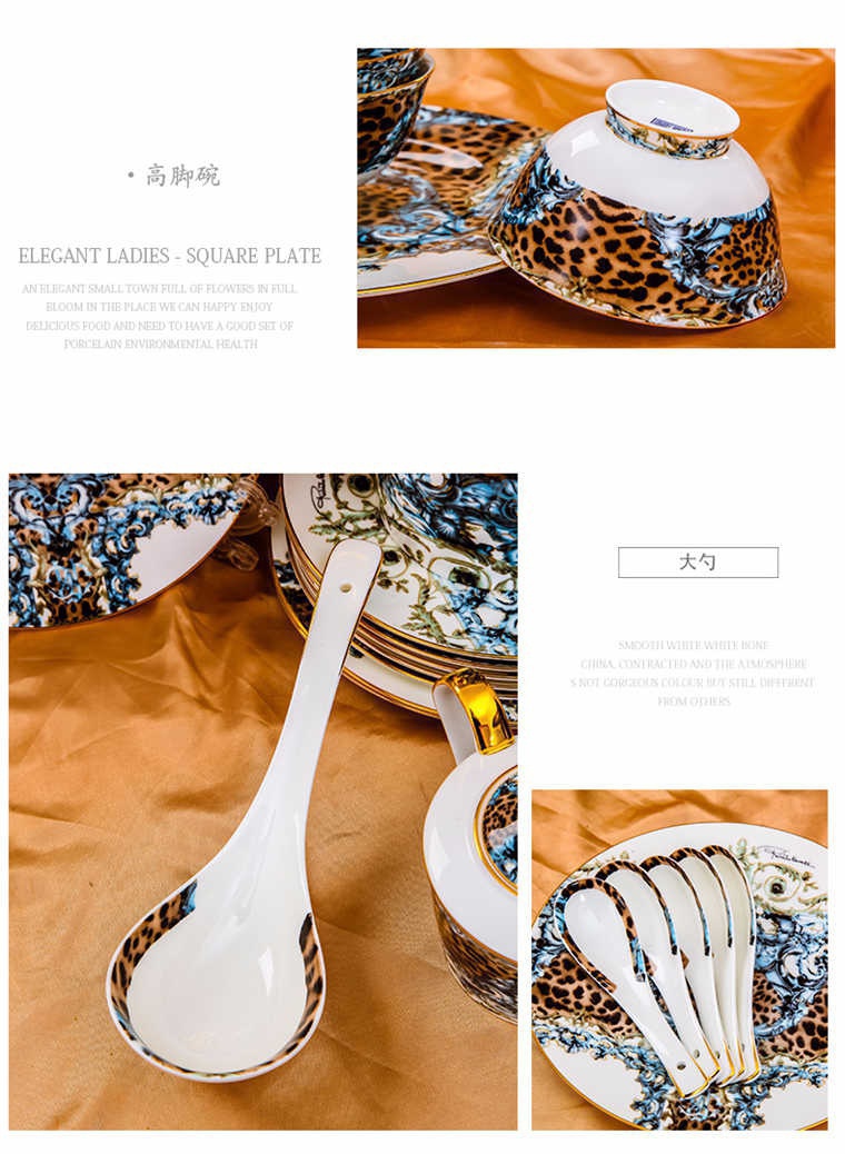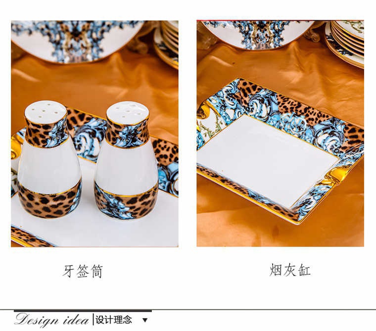 71頭范思哲豹紋餐具,一個(gè)湯煲,一個(gè)大湯碗,一個(gè)大湯勺,一個(gè)煙缸,兩個(gè)胡椒瓶,一個(gè)魚盤,一個(gè)10寸盤,六個(gè)9寸深盤,六個(gè)8寸平盤,六個(gè)8寸月光盤,十個(gè)4.5寸飯碗,十個(gè)小勺,十個(gè)筷子架,一個(gè)咖啡壺,一個(gè)糖缸,一個(gè)奶罐,六個(gè)咖啡杯,六個(gè)碟。