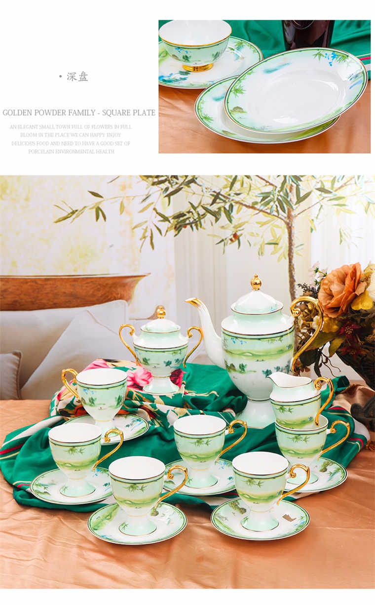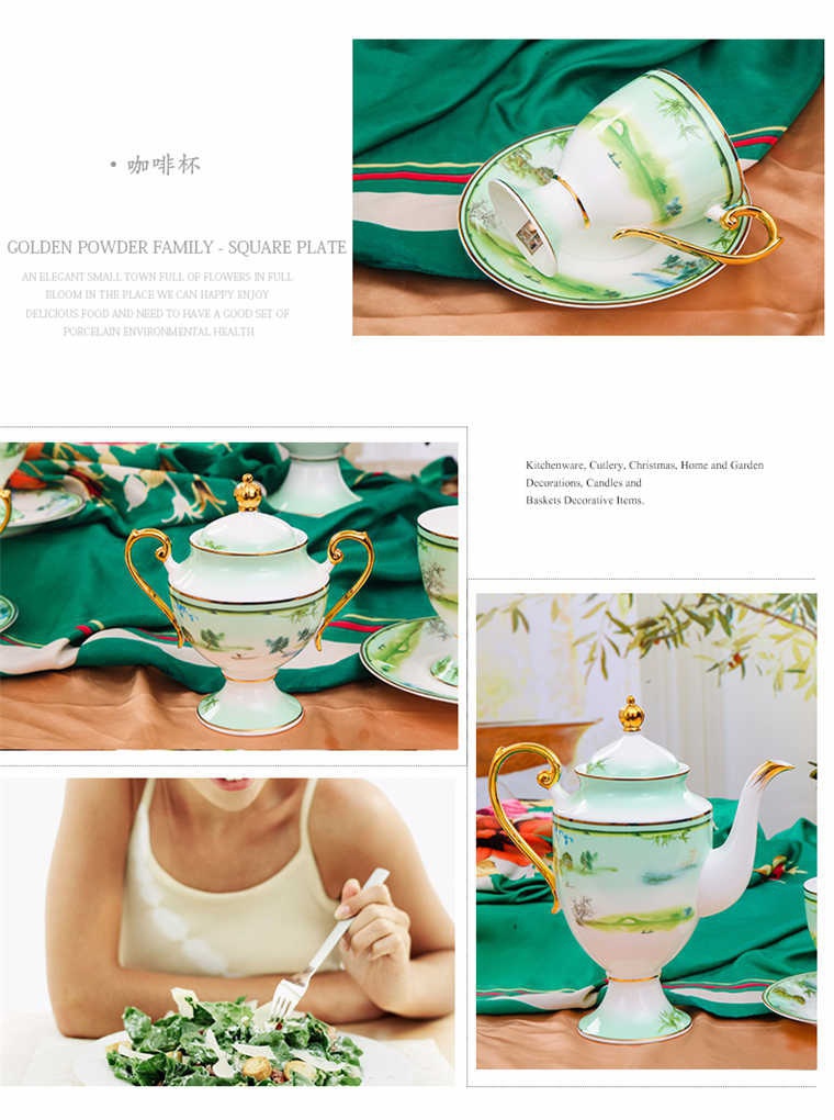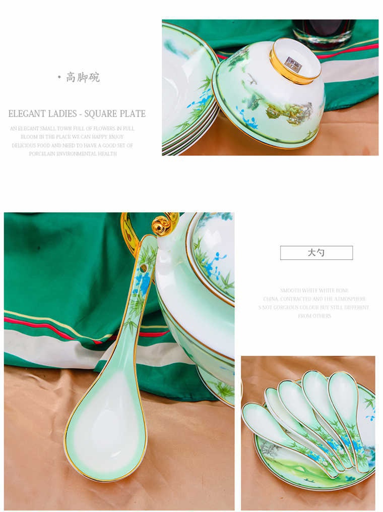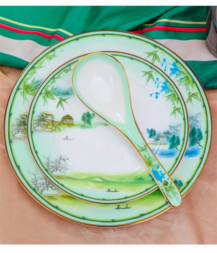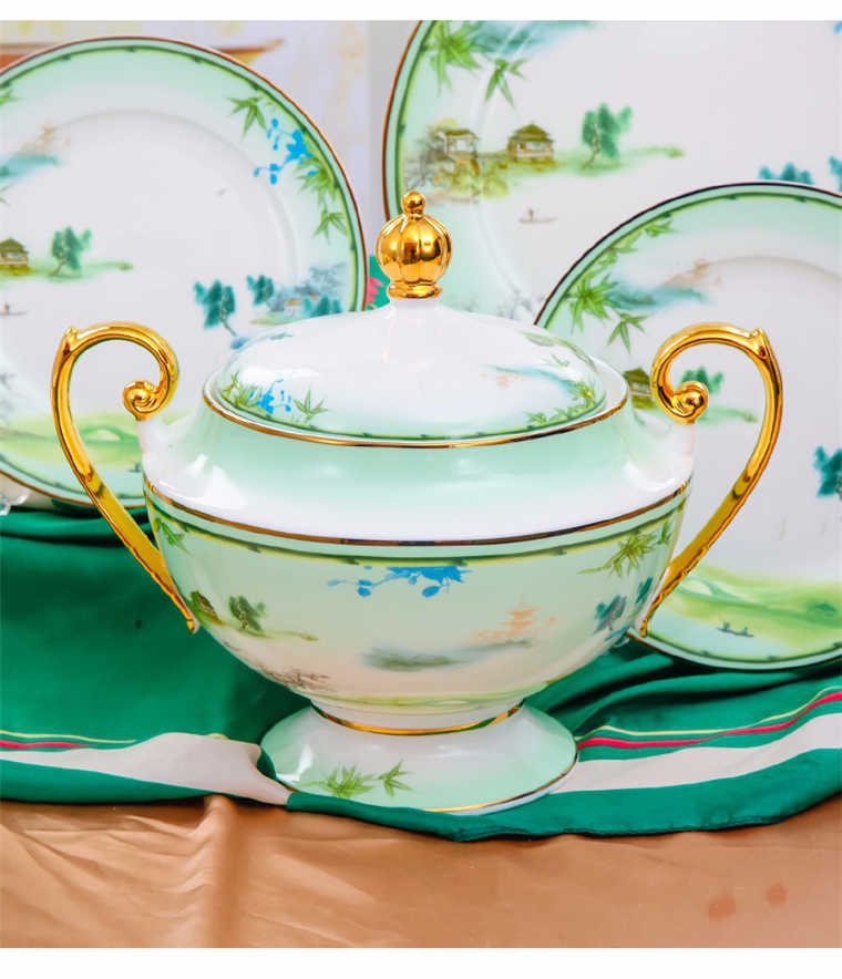 73頭西湖美景,一個(gè)湯煲,一個(gè)大湯勺,一個(gè)煙缸,一個(gè)牙簽筒,一個(gè)魚(yú)盤(pán),一個(gè)10寸平盤(pán),兩個(gè)面碗,十個(gè)8寸盤(pán),十個(gè)5寸骨碟,十個(gè)4.5寸飯碗,十個(gè)小勺,十個(gè)筷子架,一個(gè)咖啡壺,一個(gè)糖缸,一個(gè)奶罐,六個(gè)咖啡杯,六個(gè)碟。